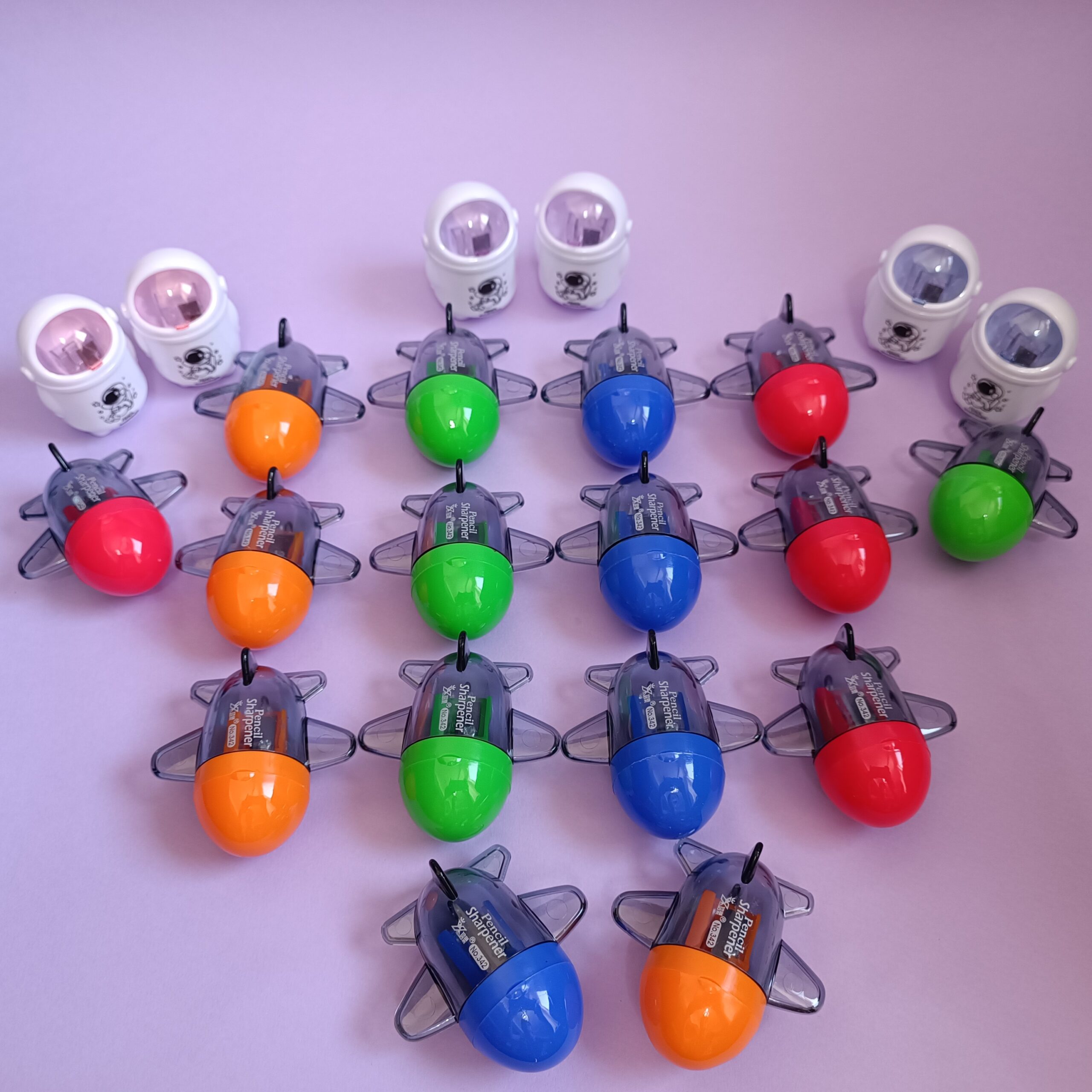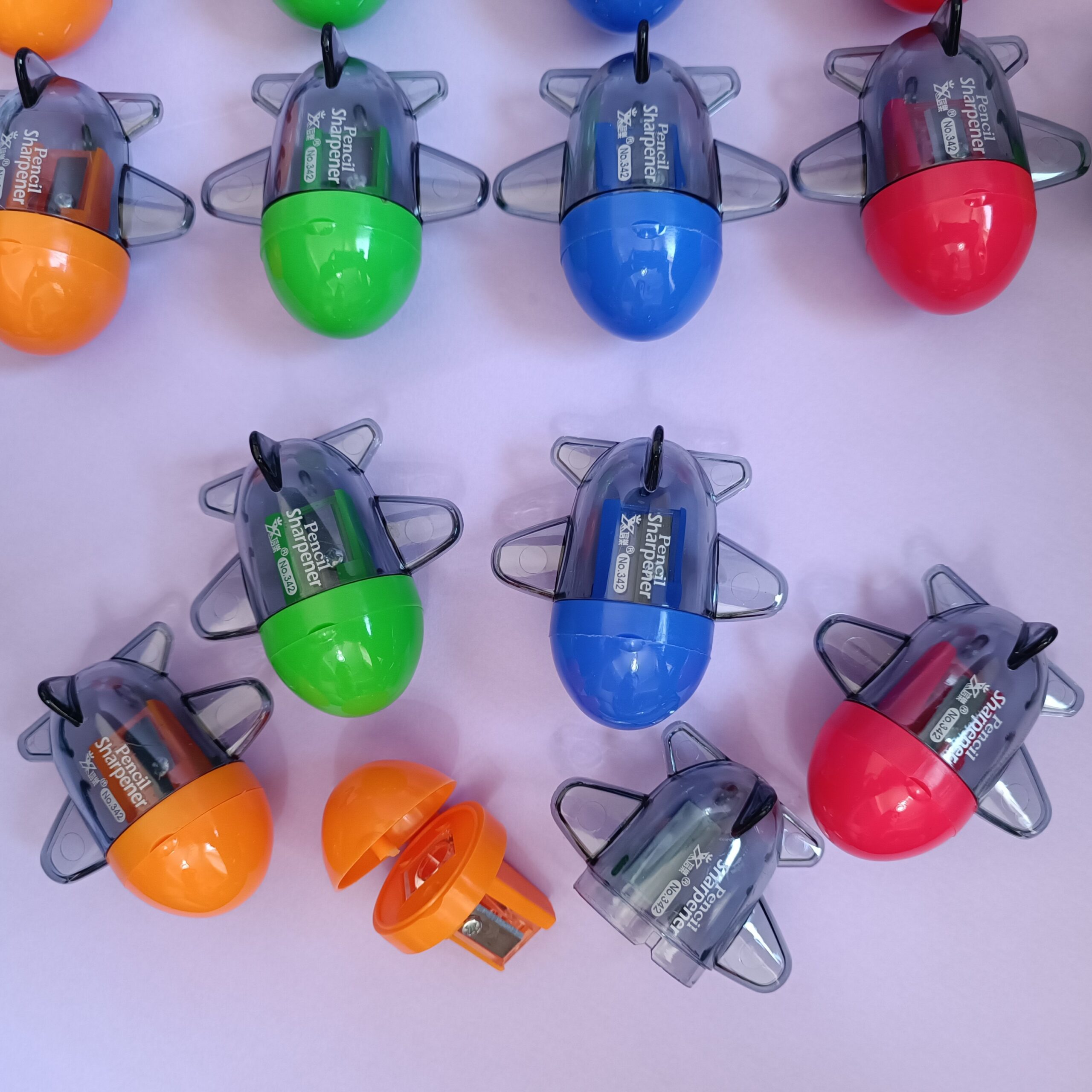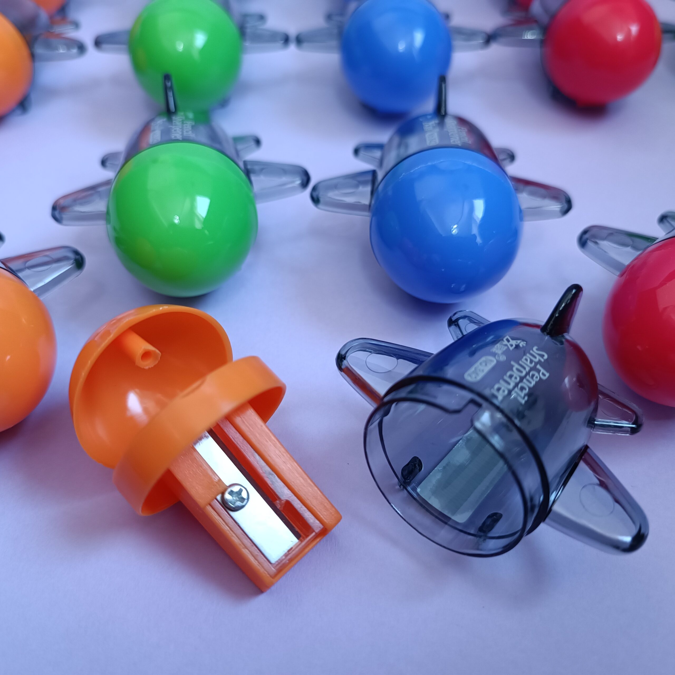 تراش مخزن دار موشکی در چهار رنگ شاد با طراحی خلاقانه و مخزن شفاف. مناسب مدادهای معمول و رنگی، سبک، بادوام و جذاب برای مدرسه و دفتر.