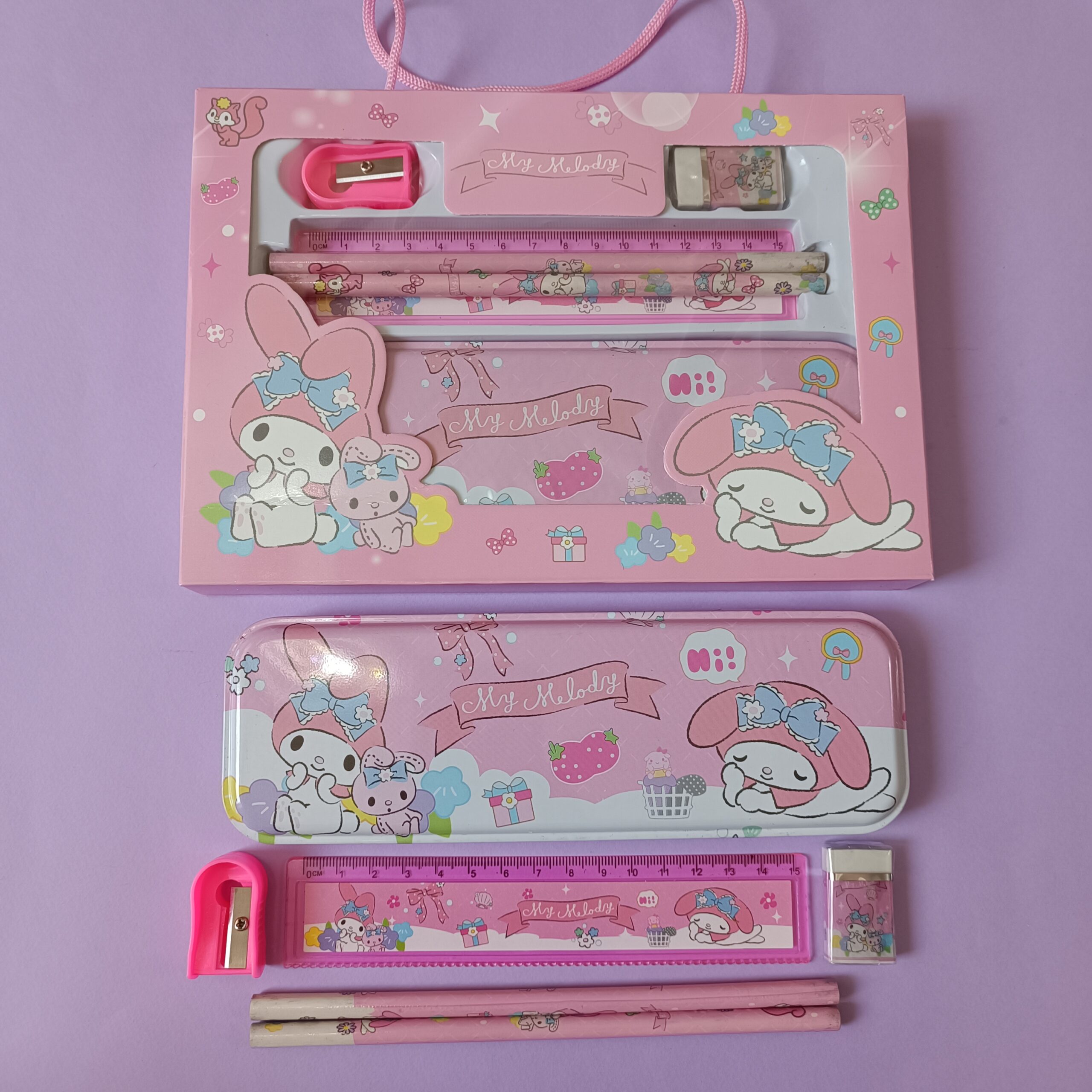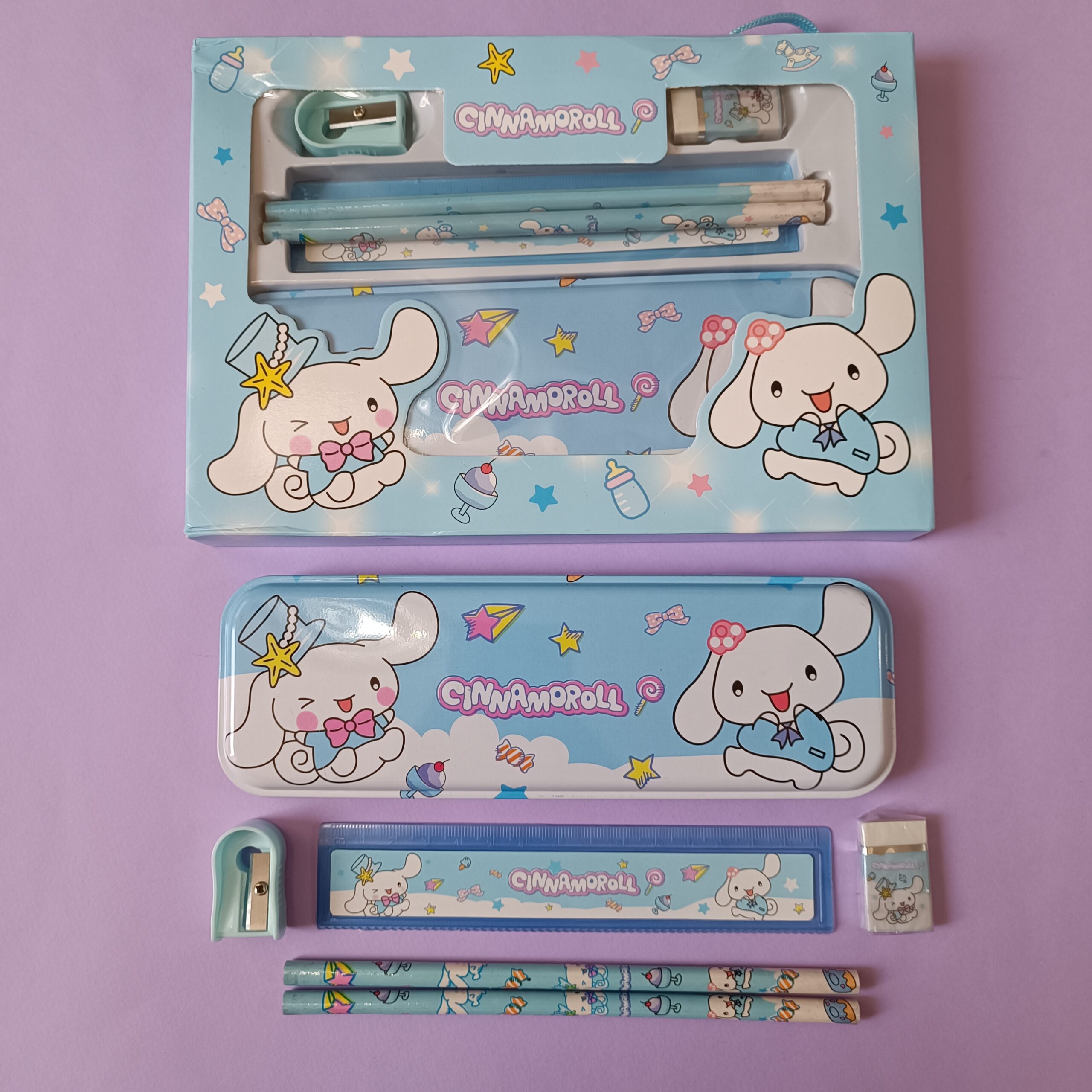 ست تحریر همراه با جامدادی فلزی کرومی و دوستان ارزان و باکیفیت شامل جامدادی فلزی، مداد، پاککن، تراش و خطکش – طرح کرومی، مای ملودی و سینامورول؛ جذاب، مقاوم و عالی برای هدیه.