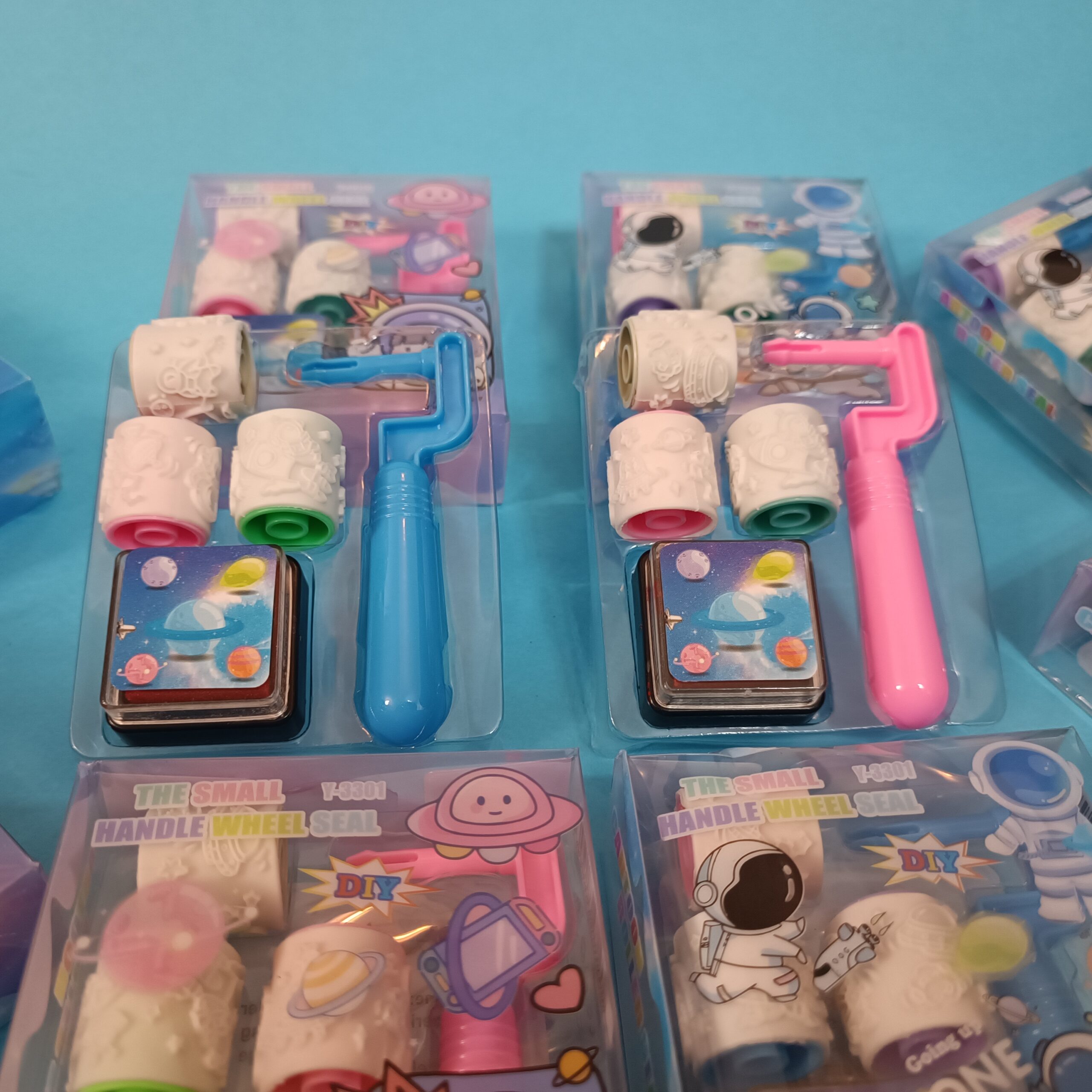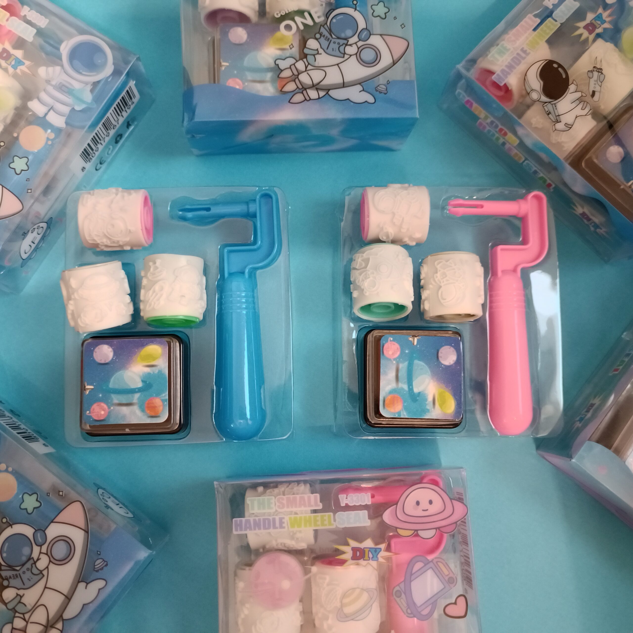 هر بسته شامل یک دستهی پلاستیکی دستی (آبی یا صورتی)، سه غلطک مهر با طرحهای برجسته متنوع (فضانورد، سفینه، ستارهها و سیارات) و یک جوهردان رنگی است که بهصورت جداگانه درون بستهبندی قرار گرفتهاند. جنس غلطکها از لاستیک نرم ضدخش بوده و با رنگهای شاد بهراحتی روی انواع دفتر، نامه، برچسب و کارت پستال چاپ میشوند.