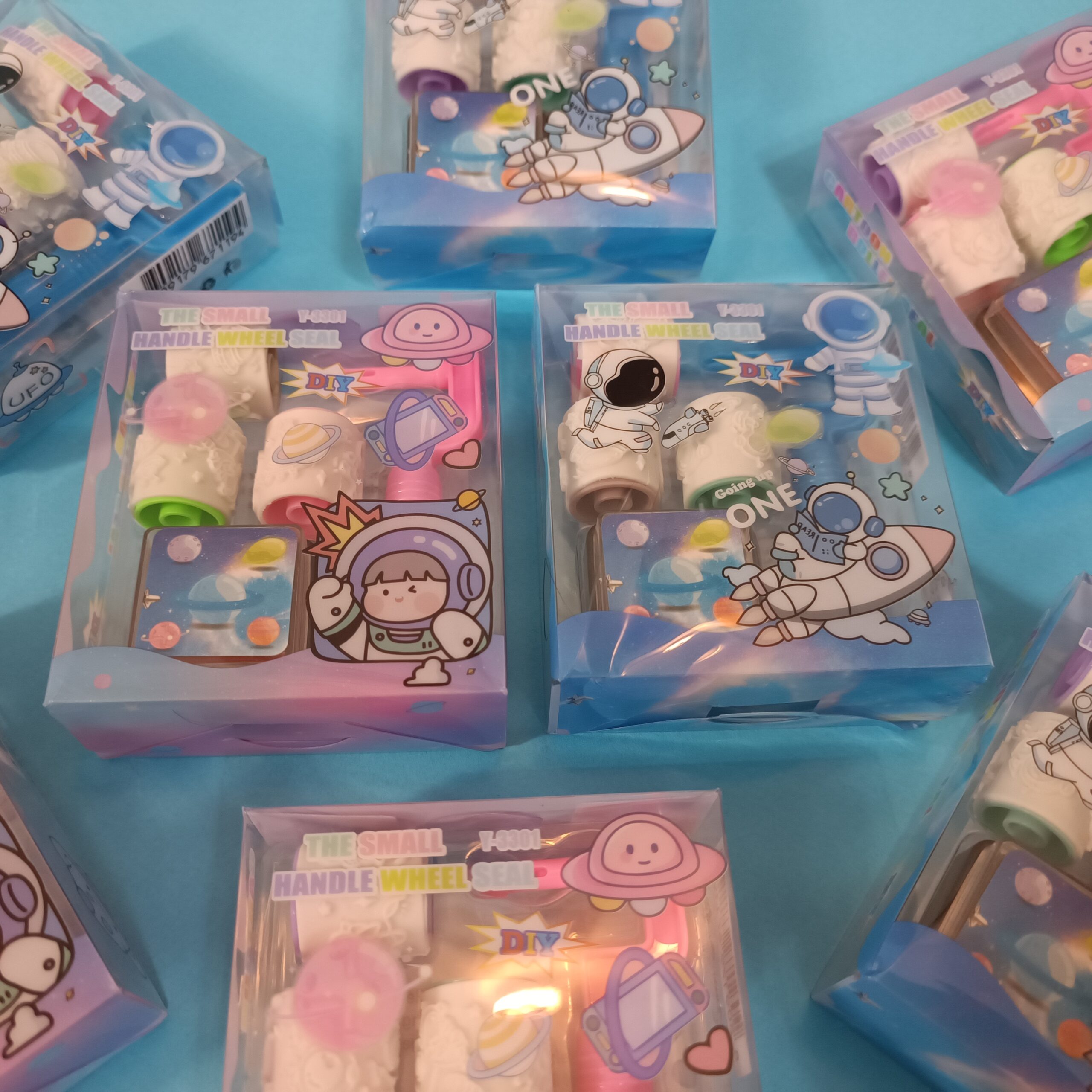 مهر غلطکی فضانورد سه سر ارزان و باکیفیت با طرحهای سفینه و سیاره، مناسب تزئین دفتر و کاردستی کودکانه با بستهبندی شفاف و رنگهای شاد فانتزی.