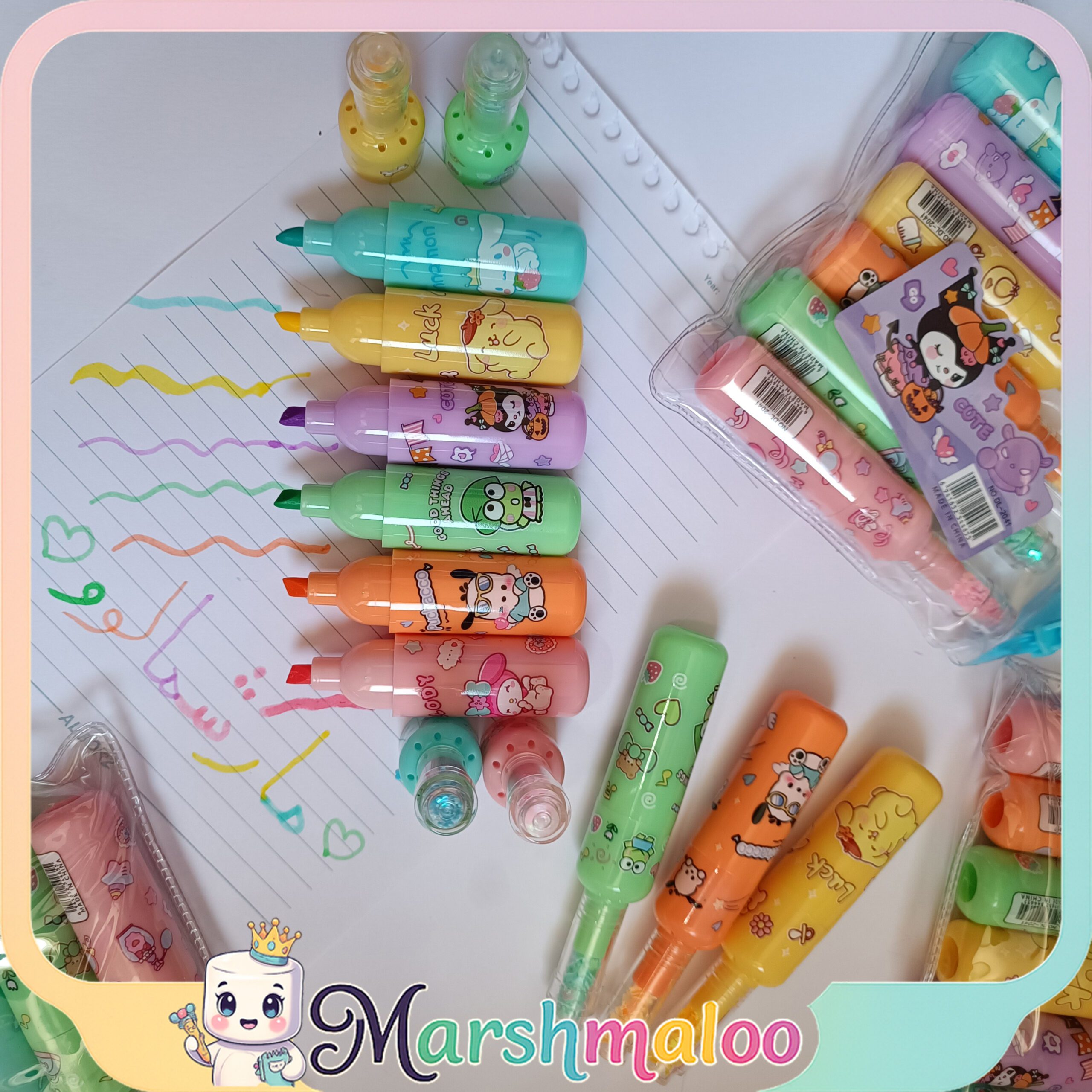 هایلایتر کرومی و دوستان ۶ عددی با رنگهای شاد و بدنه فانتزی شخصیتهای Kuromi، My Melody، Cinnamoroll، Pompompurin و Pochacco، تستشده و تاریخ جدید. نوک پهن، روان و ماندگار.