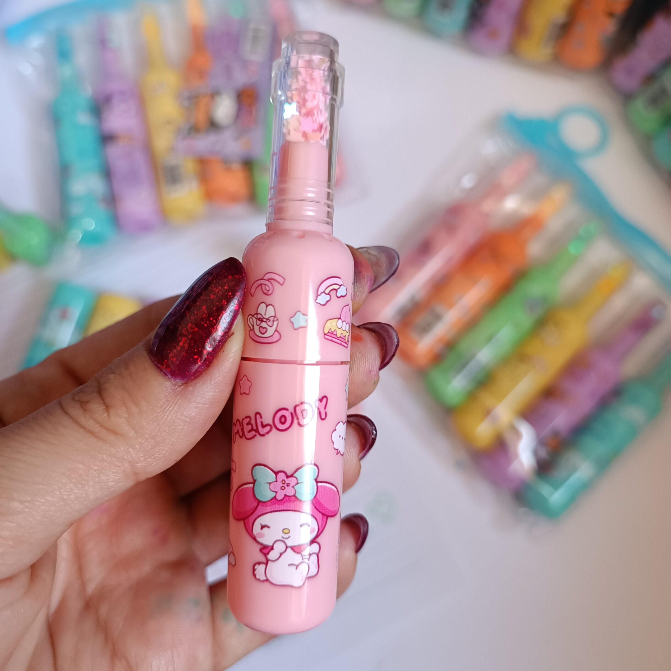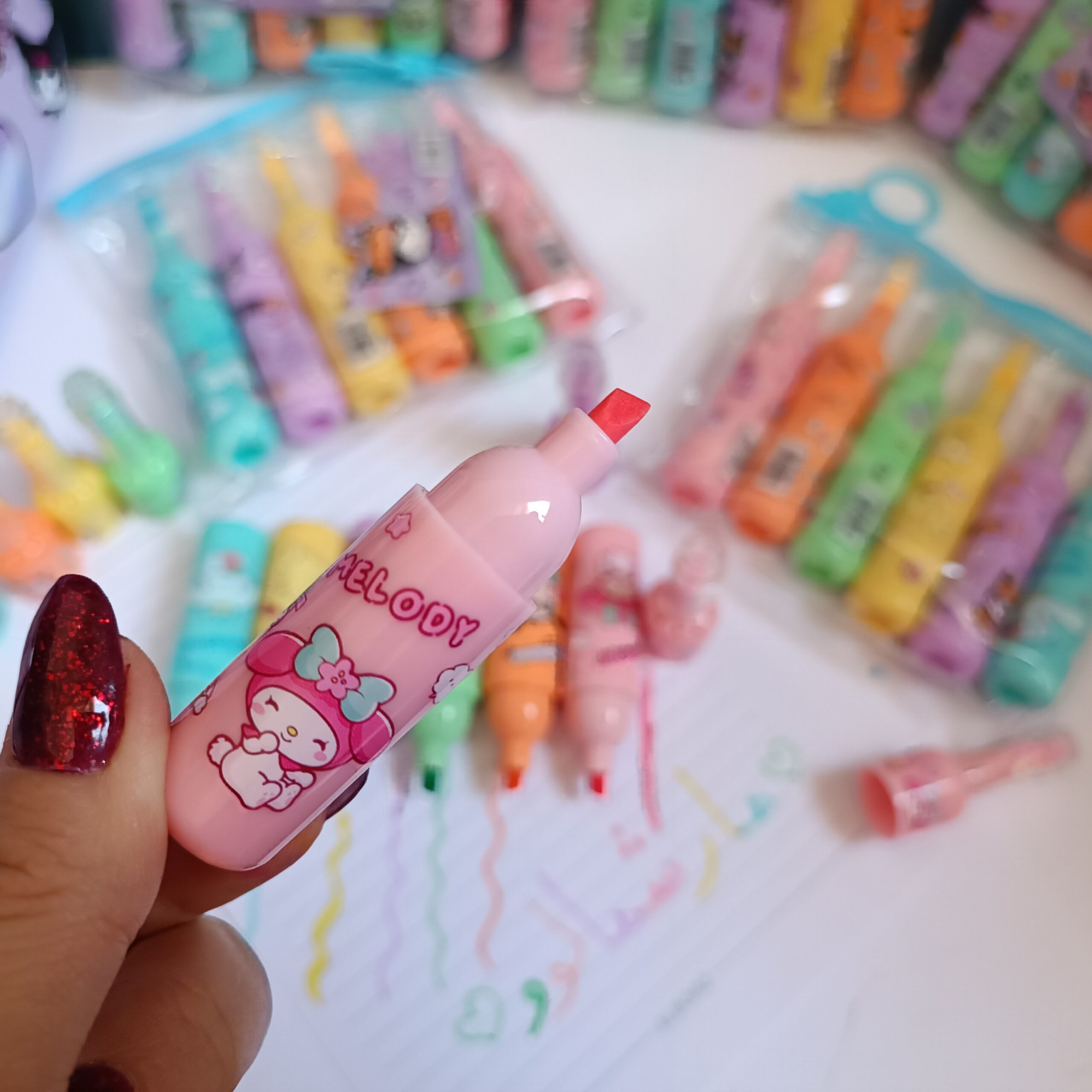هر قلم دارای طراحی فانتزی و منحصربهفرد با شخصیتهای محبوب Kuromi، My Melody، Cinnamoroll، Pompompurin و Pochacco است که ظاهری دلنشین و انگیزهبخش به میز کار یا کیف لوازمتحریر شما اضافه میکند. قسمت بالایی هایلایترها با ذرات براق و ستارهای تزئین شده که هر بار نوشتن را تبدیل به تجربهای جذاب میکند.