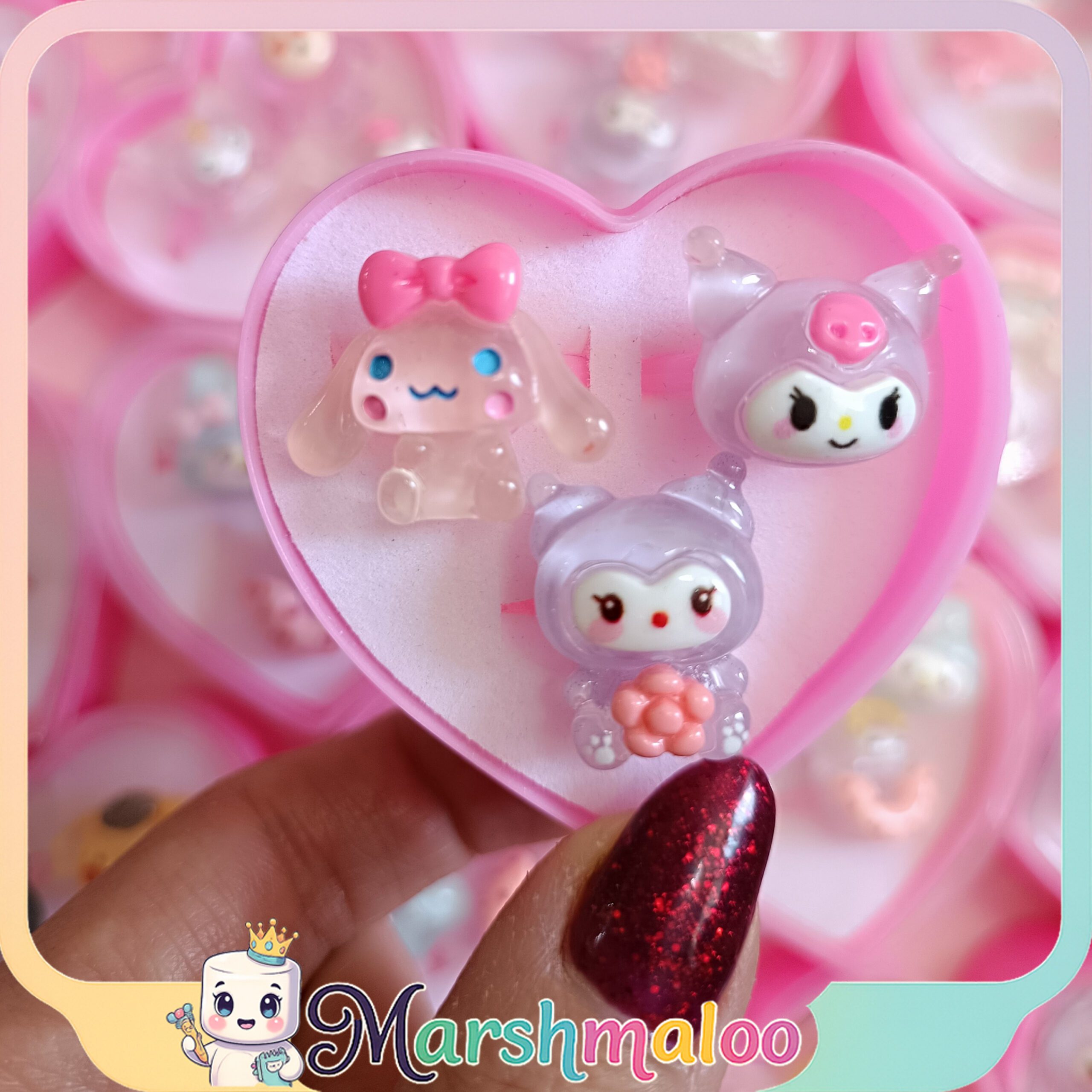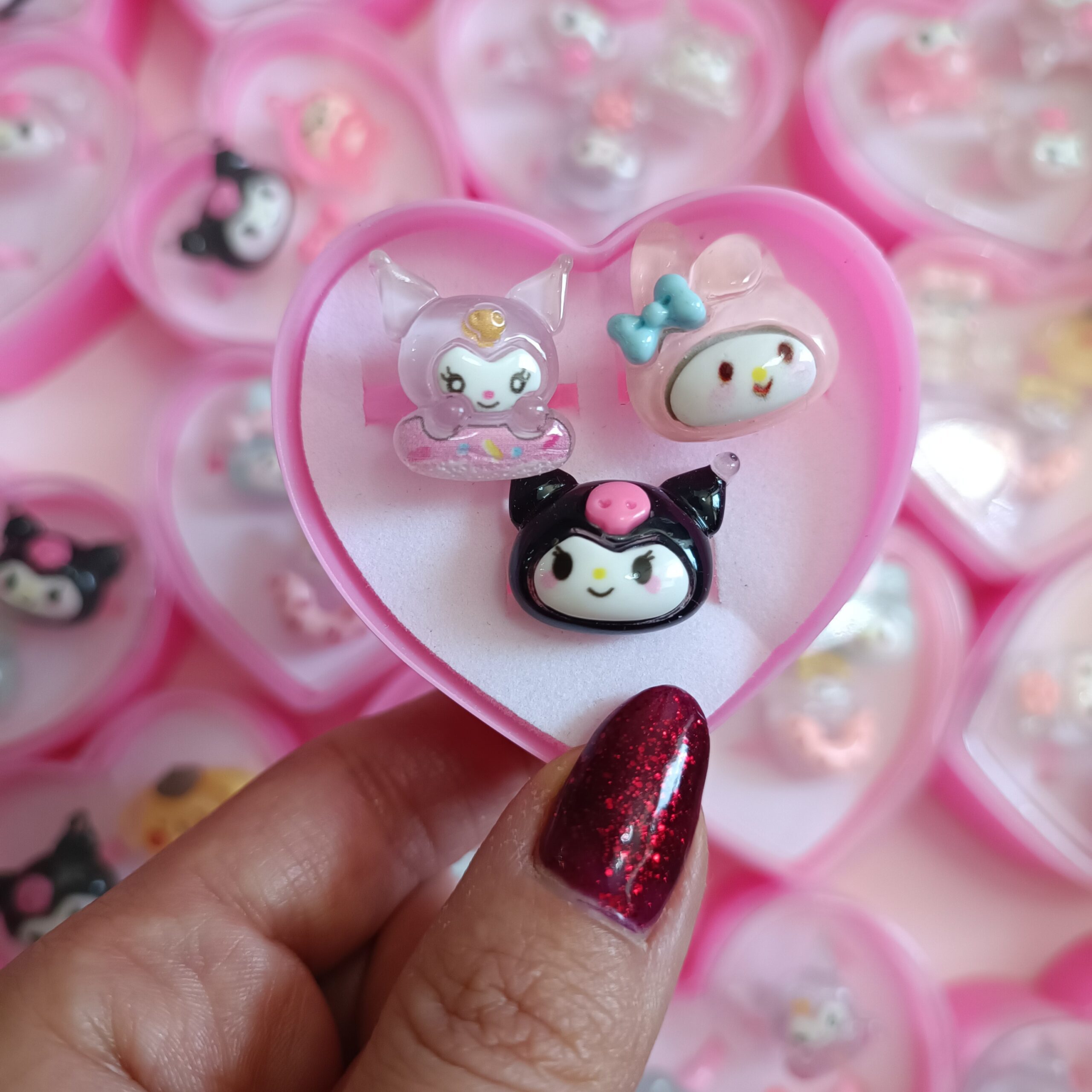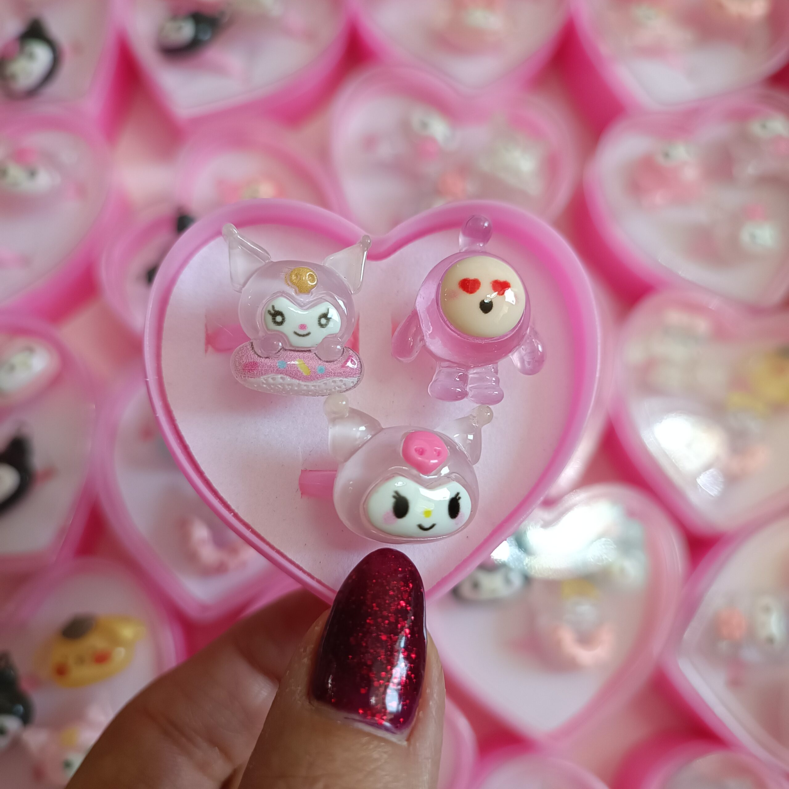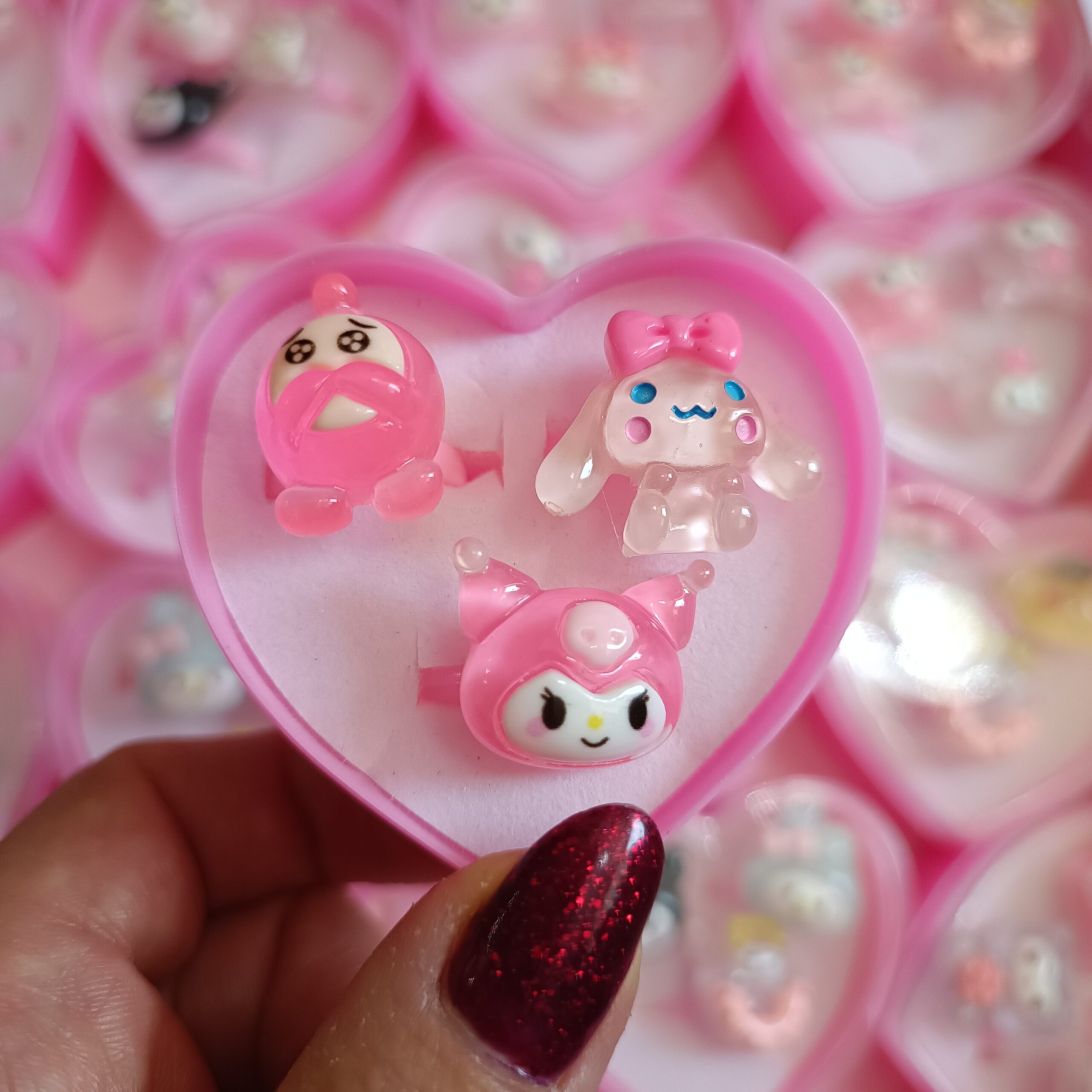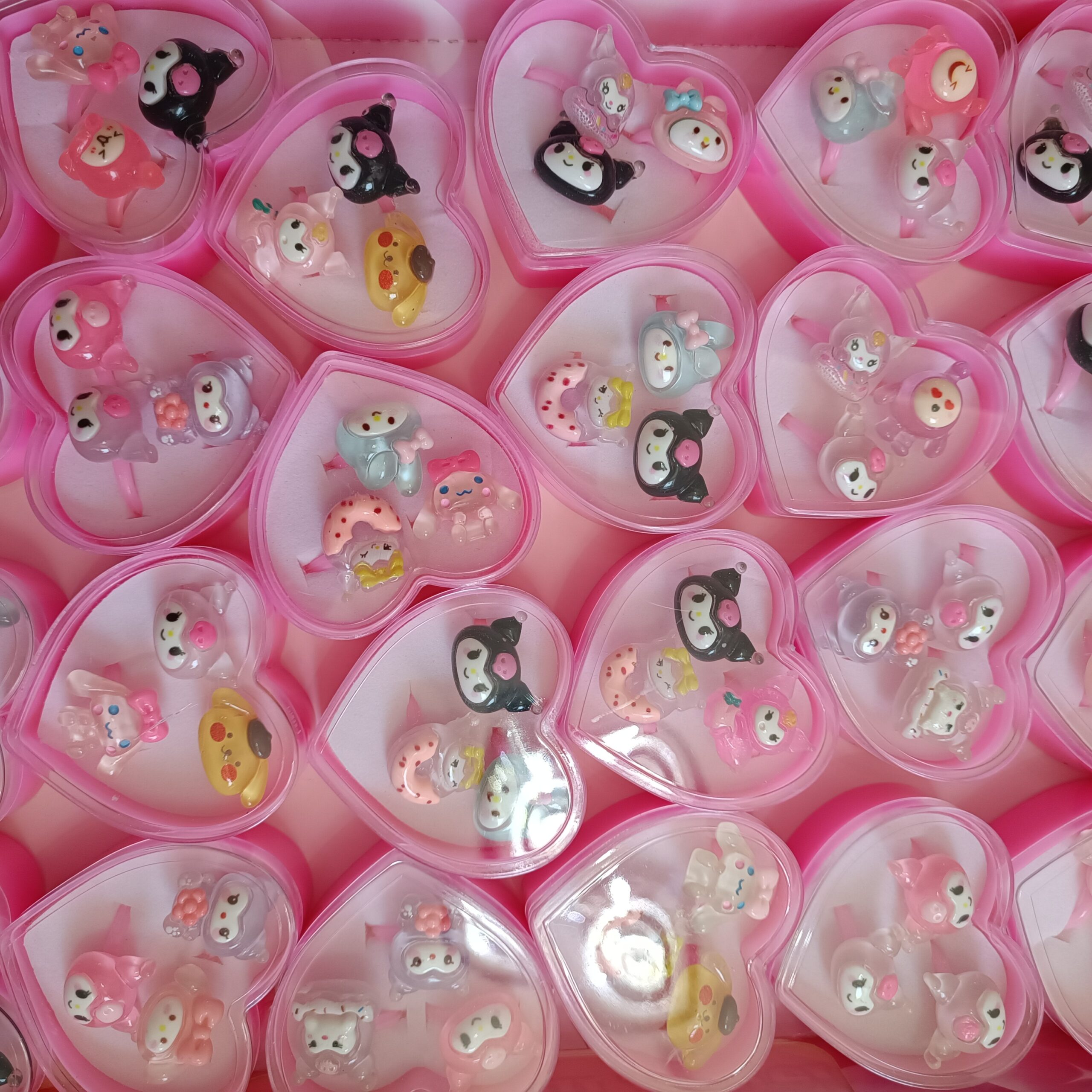 انگشترها در یک جعبه قلبی شفاف و صورتی رنگ قرار دارند که علاوه بر زیبایی، برای هدیه دادن یا نگهداری این کاراکترهای کوچک و دوستداشتنی ایدهآل است. اندازه آنها بهگونهای طراحی شده که برای دستان کودکان و نوجوانان مناسب باشد و به راحتی روی انگشت قرار میگیرد.