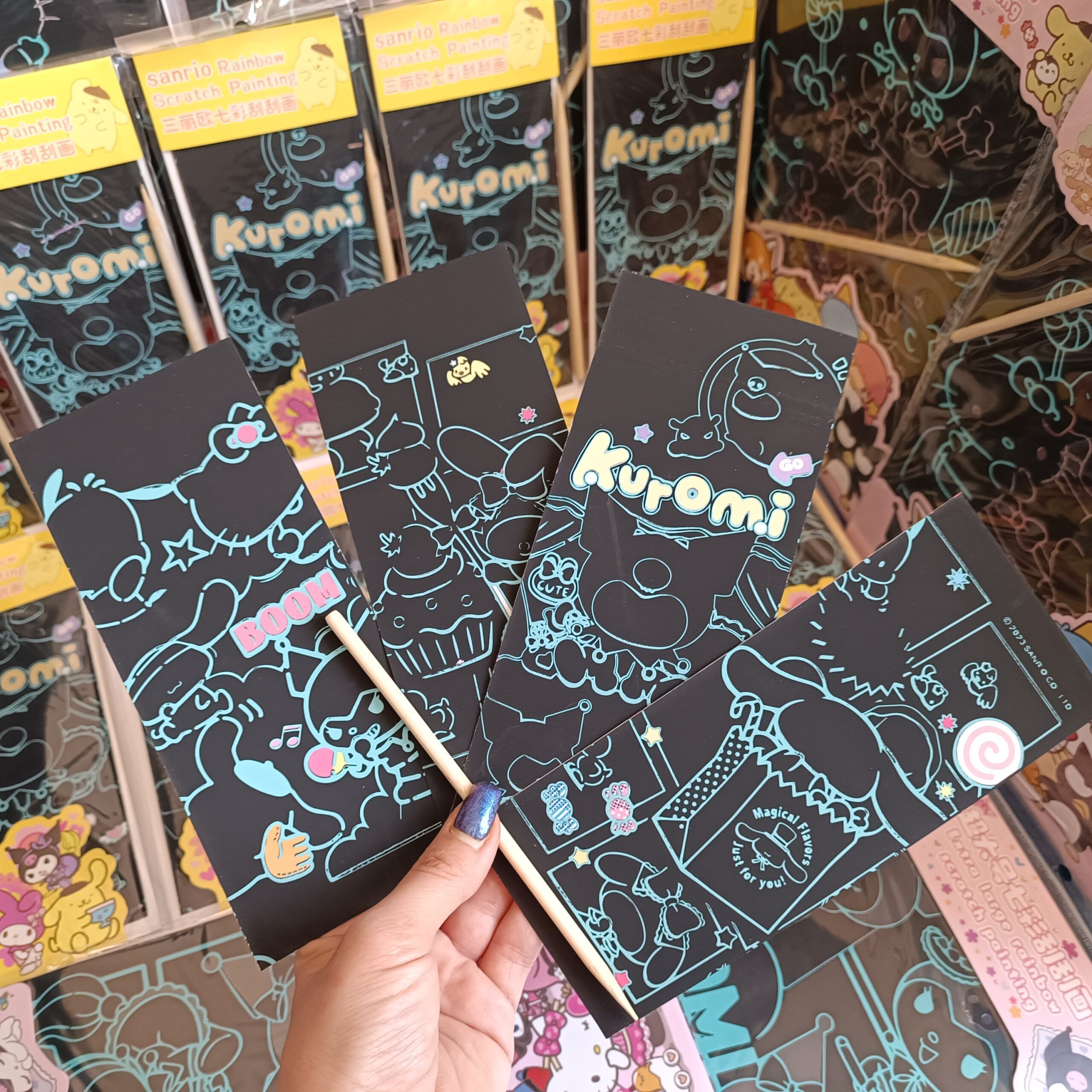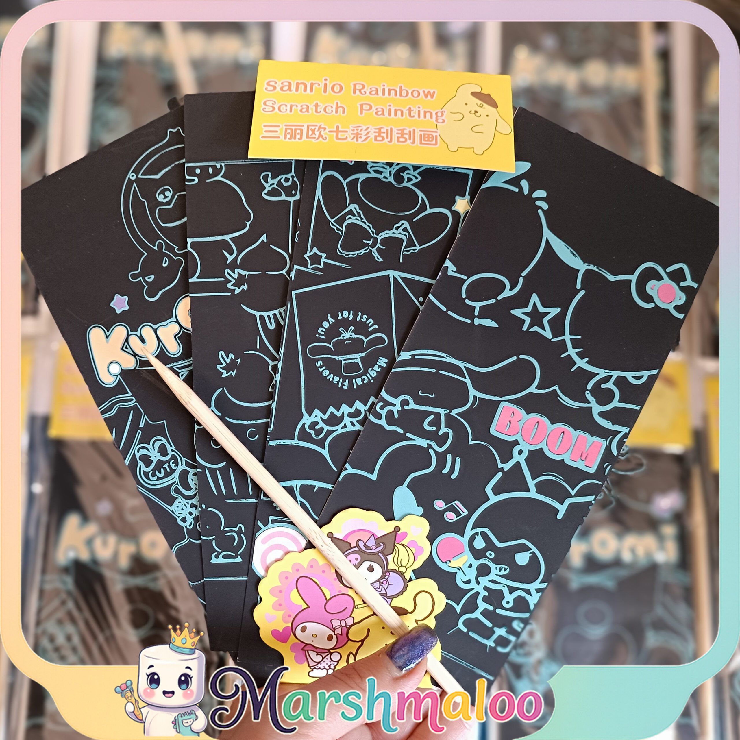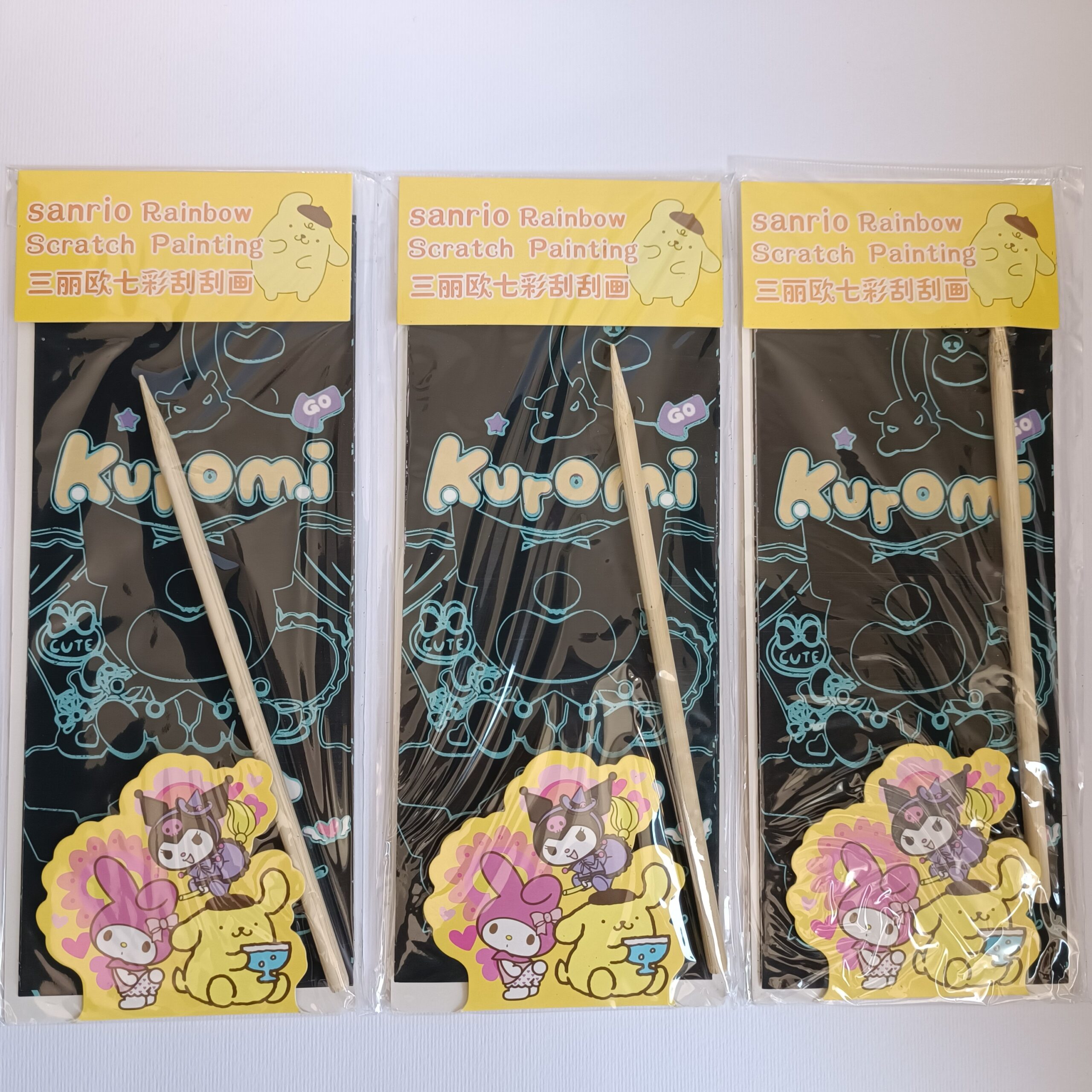 پک ۴ عددی نقاشی ذغالی کرومی و دوستان یک محصول هنری و سرگرمکننده است که با ویژگی اسکراچ یا همان خراشیدنی طراحی شده است. هر پک شامل چهار صفحه با طرحهای اختصاصی شخصیتهای محبوب سانریو مانند Kuromi، My Melody، Pompompurin و دوستانشان است. سطح سیاه هر صفحه، با استفاده از قلم چوبی مخصوص بهآرامی خراشیده میشود تا لایه رنگینکمانی زیر آن آشکار شود و تصویرهای شاد و رنگارنگ نمایان گردند.