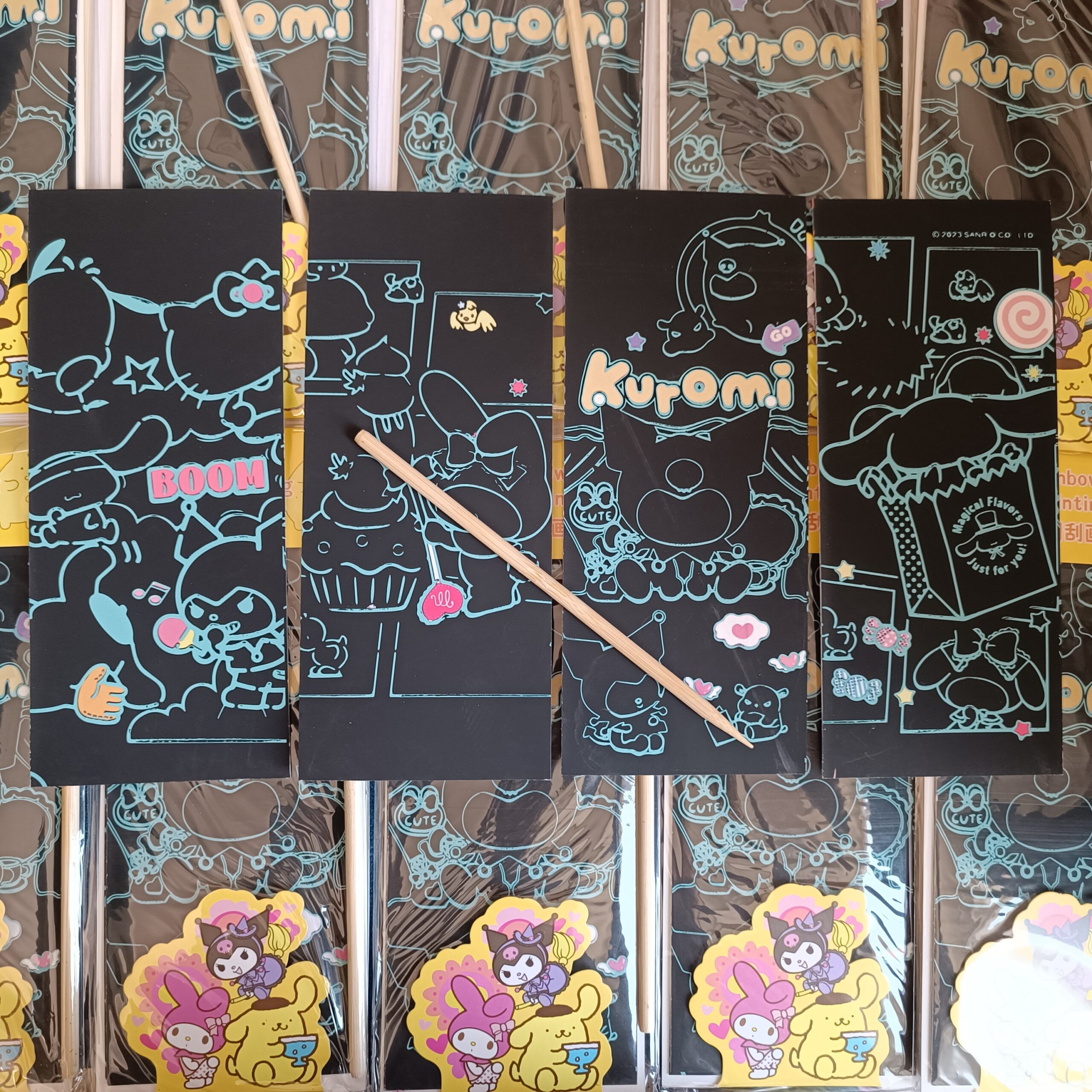 پک ۴ عددی نقاشی ذغالی کرومی و دوستان با صفحات اسکراچ (خراشیدنی) و طرحهای فانتزی رنگینکمانی؛ شامل قلم چوبی مخصوص، سرگرمی خلاقانه برای کودکان و عاشقان شخصیتهای سانریو.
