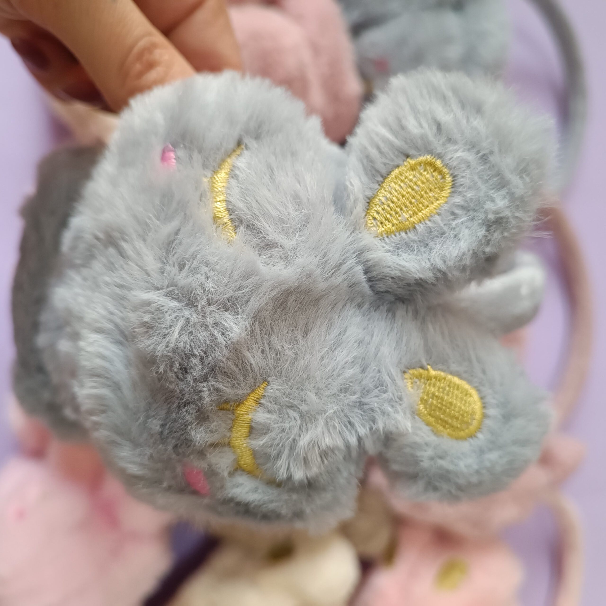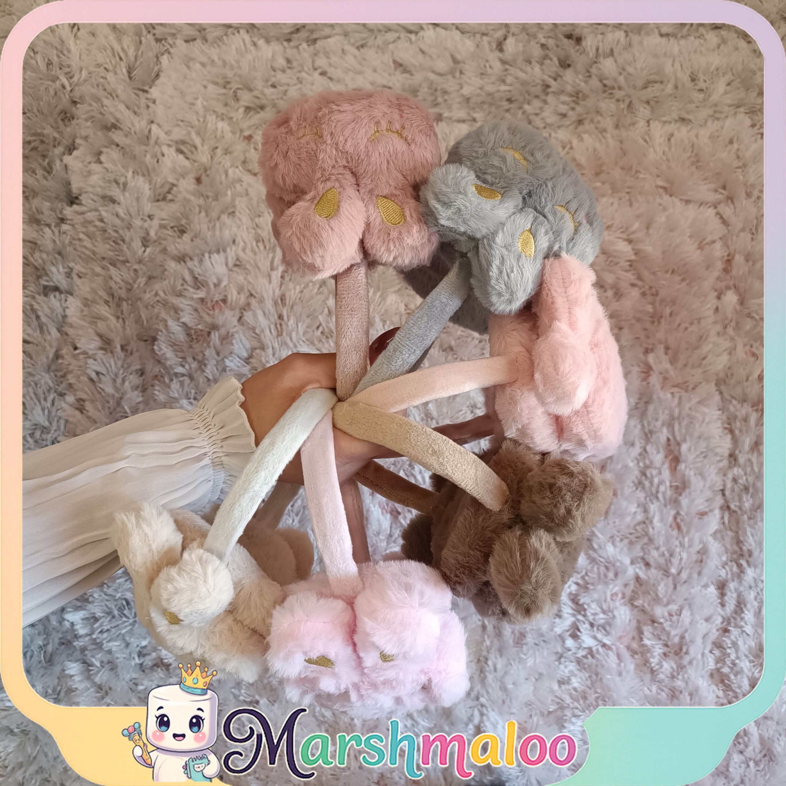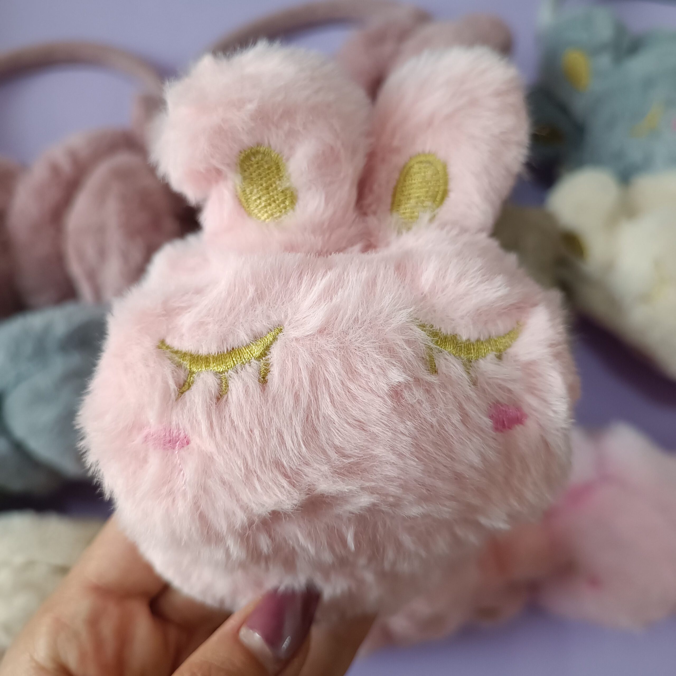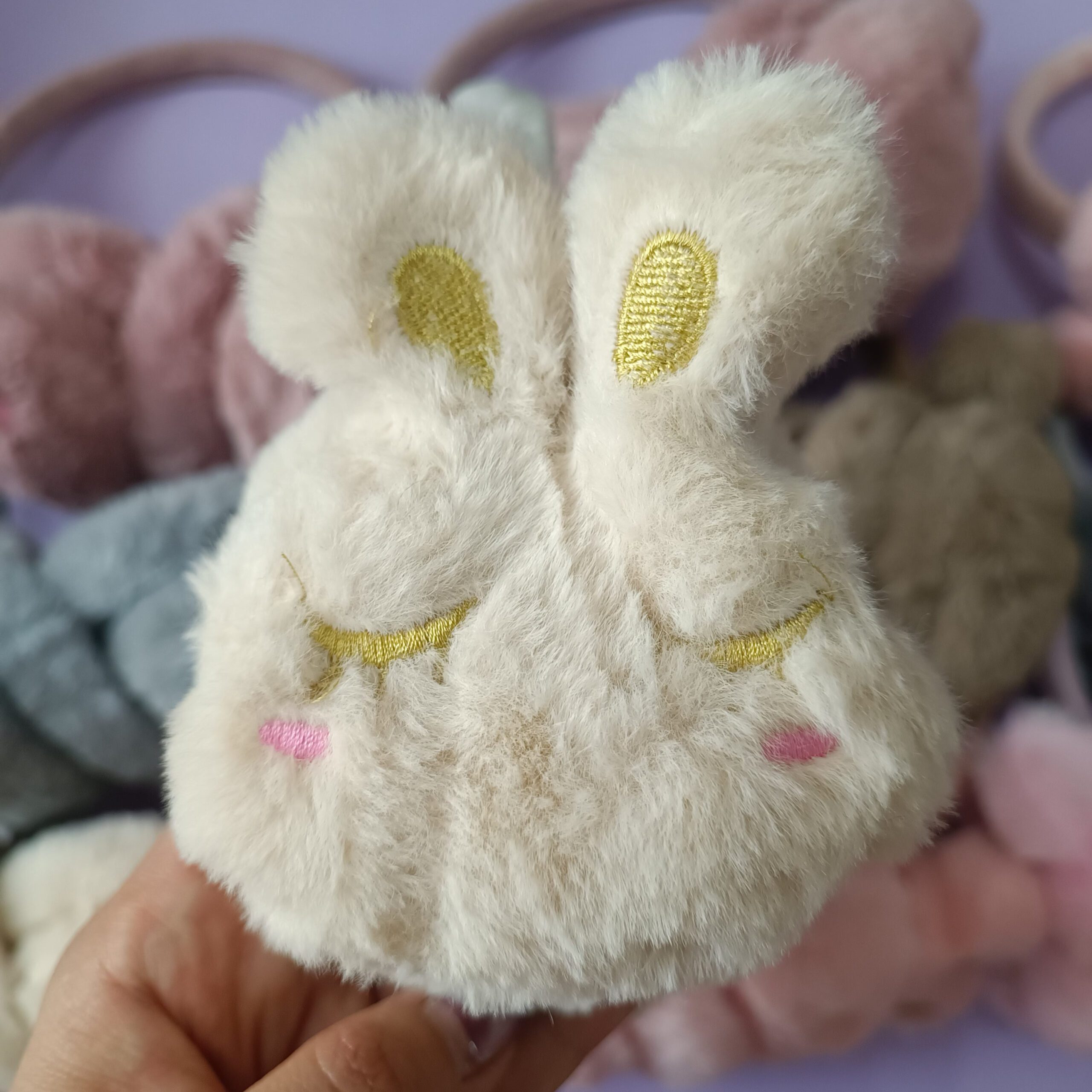 • طراحی فانتزی و پرطرفدار به فرم خرگوش تدی با گوش‌های برجسته و چشمان بسته گلدوزی‌شده