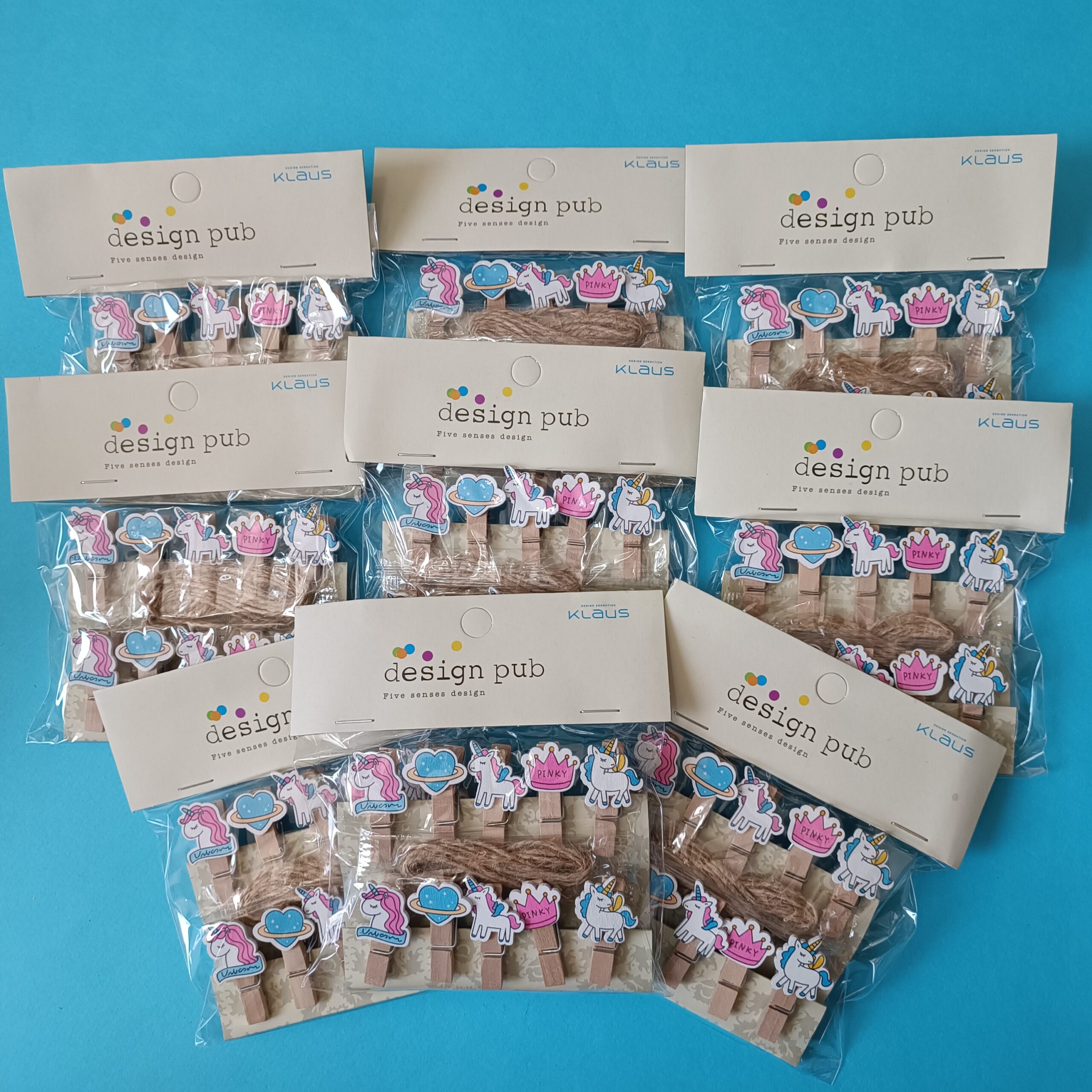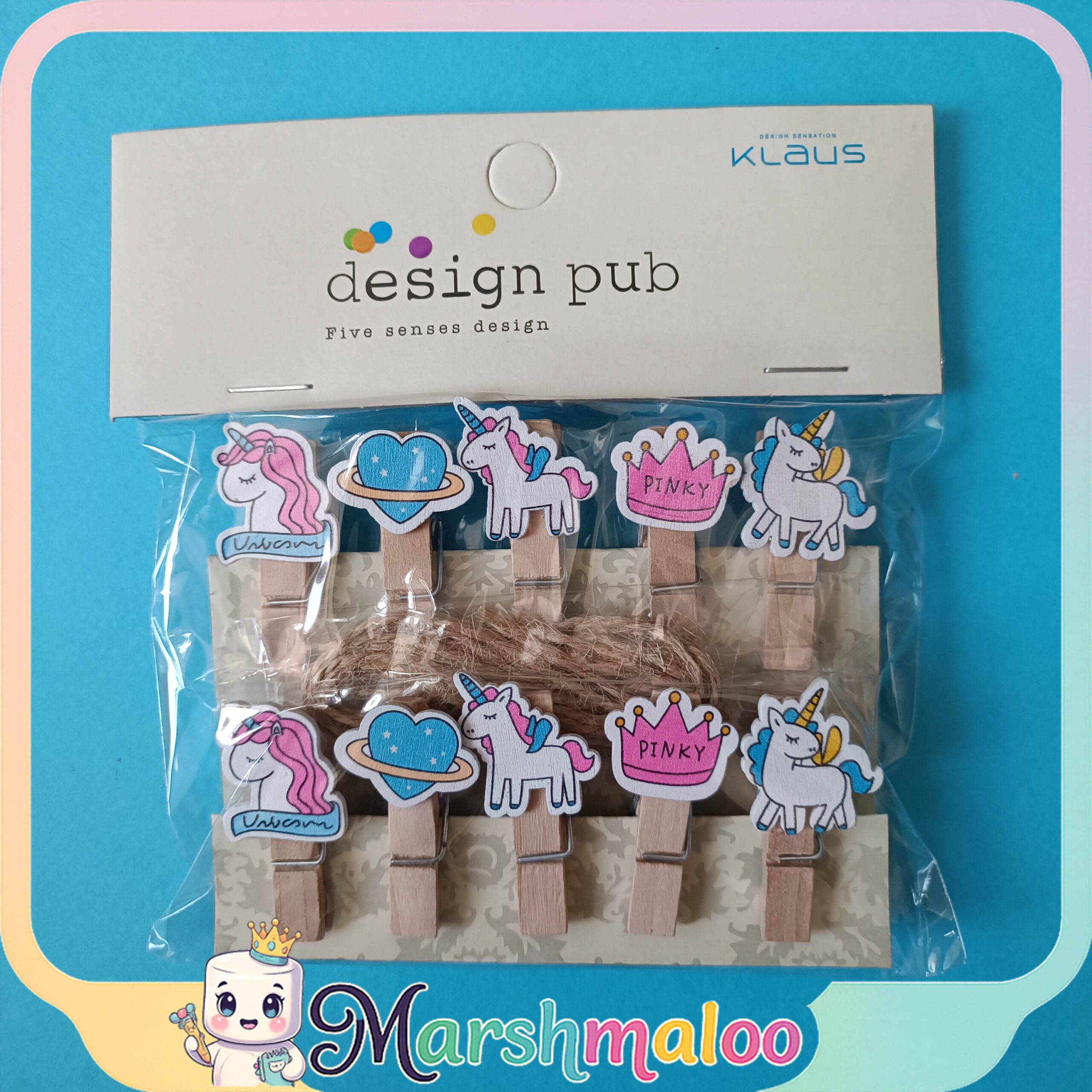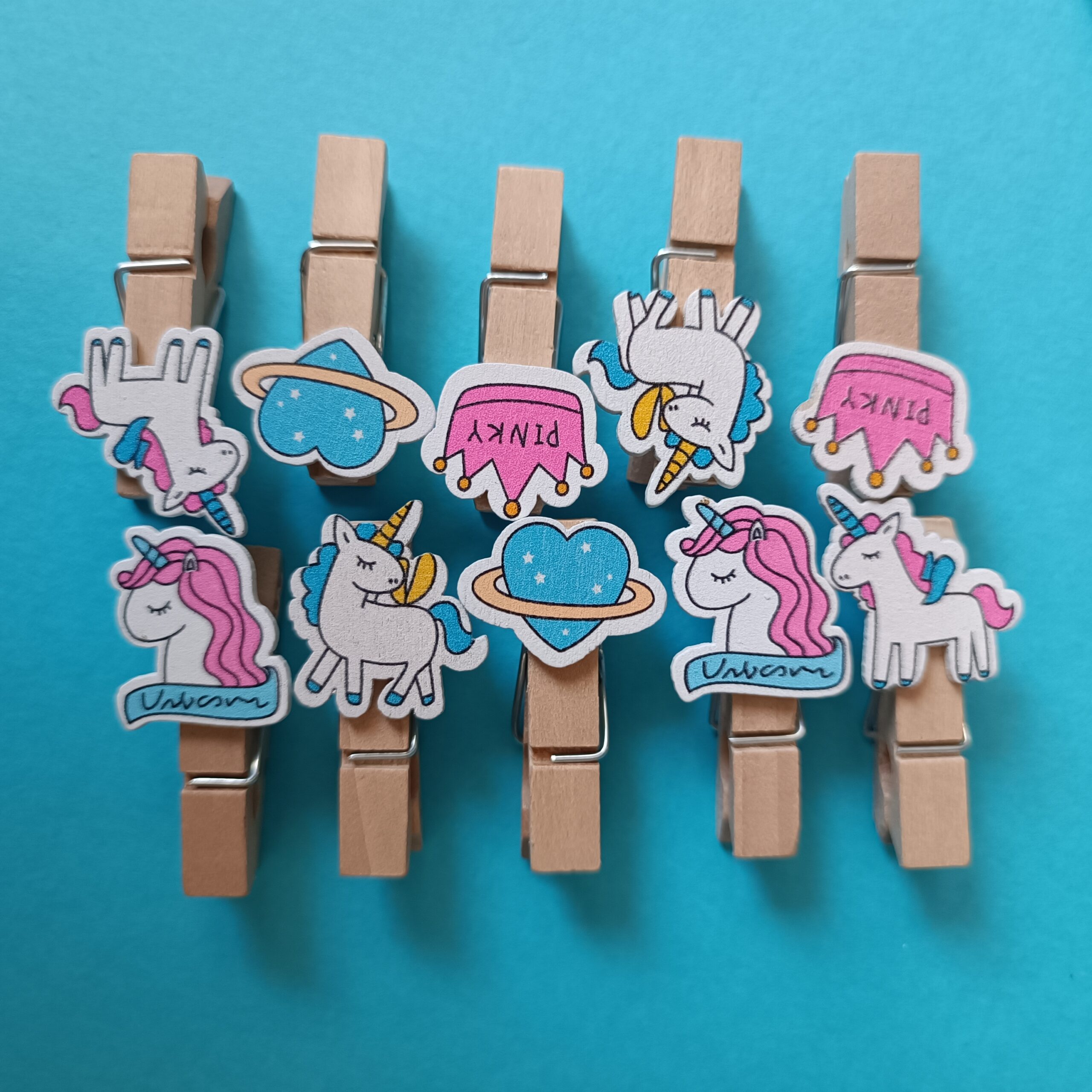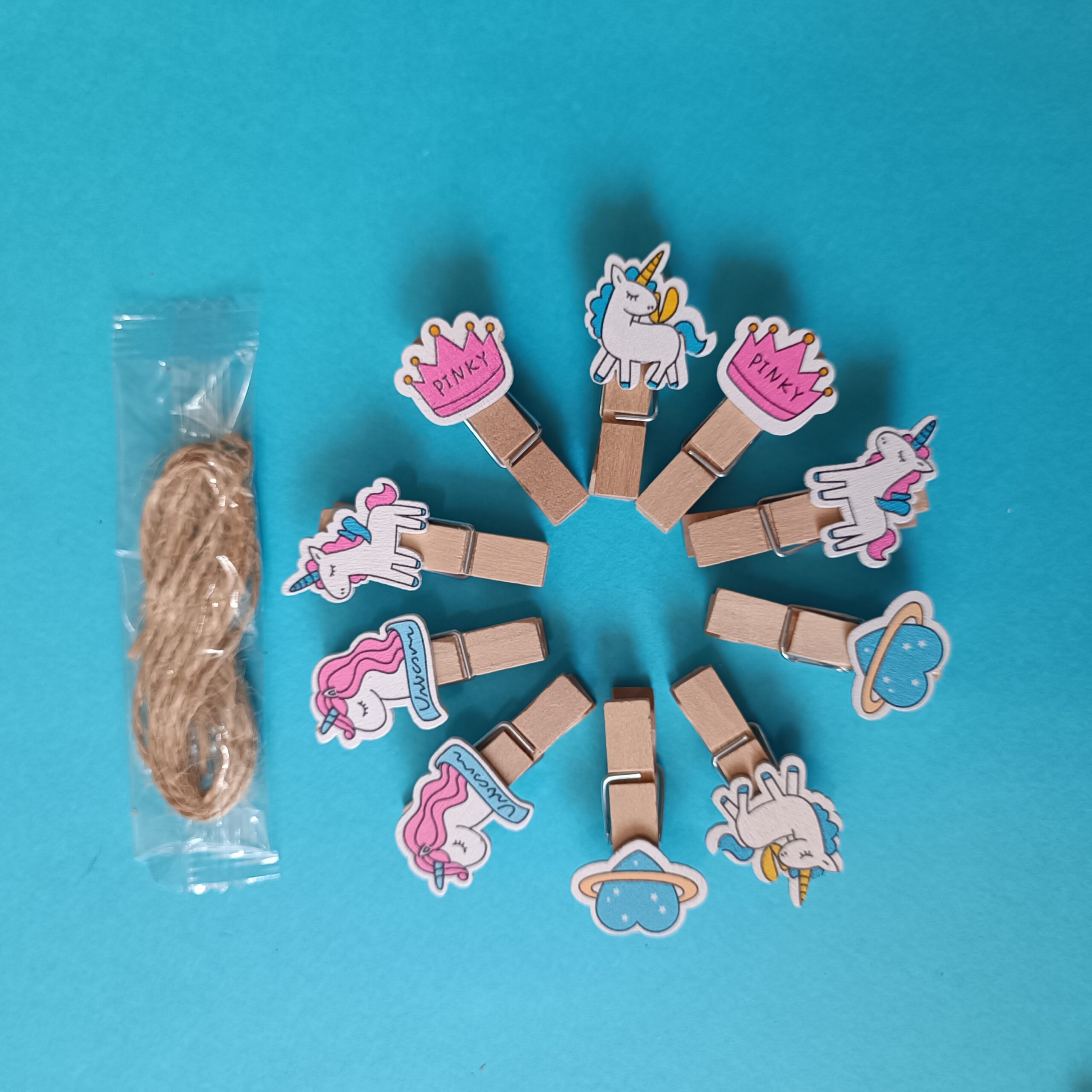 گیره چوبی عکس و یادداشت یونیکورن 10 عددی به همراه نخ کنفی با طرحهای یونیکورن، سیاره، قلب و تاج “PINKY” که هر کدام با رنگهای شاد و چاپ براق روی چوب طبیعی تزئین شدهاند.